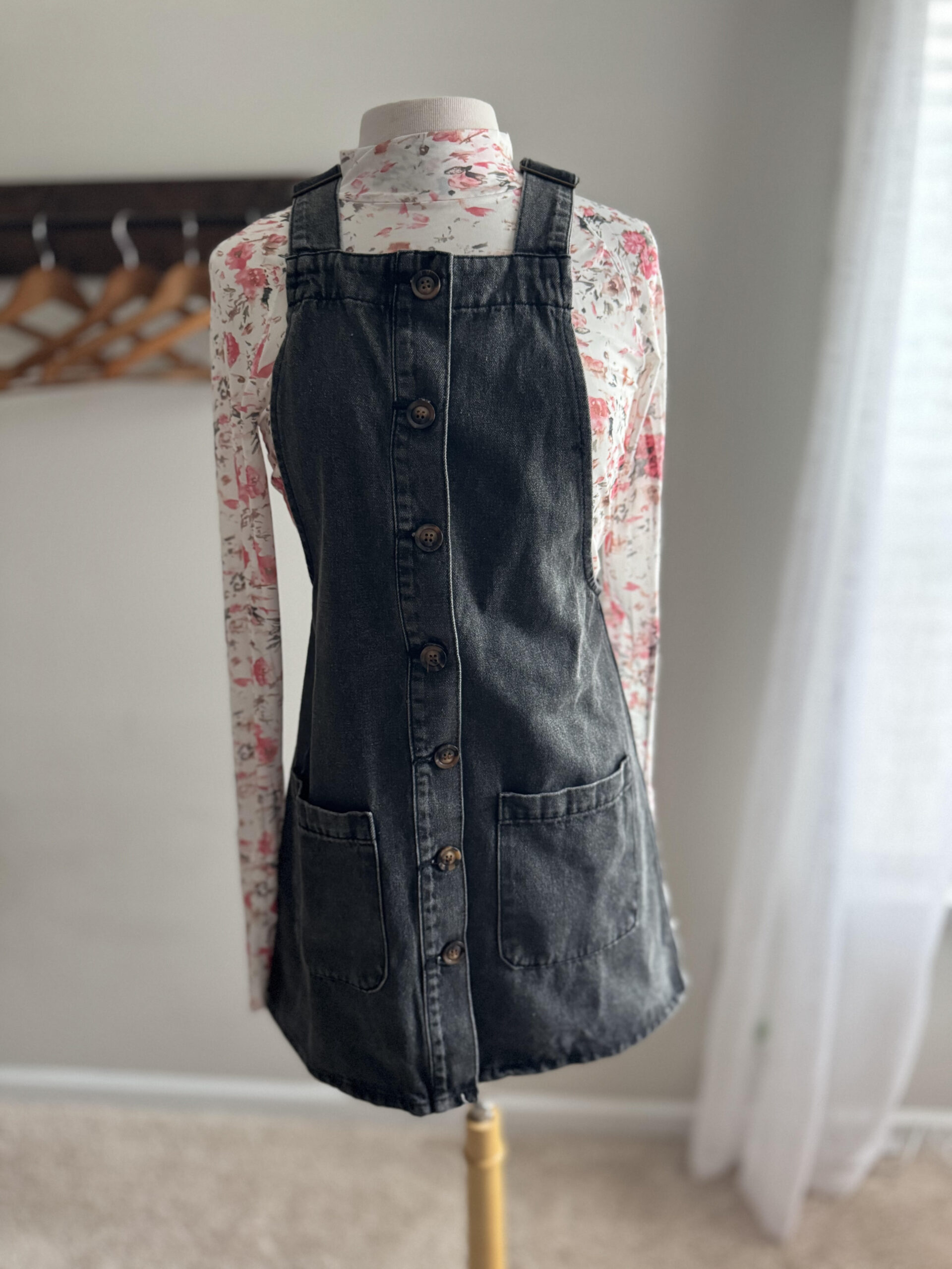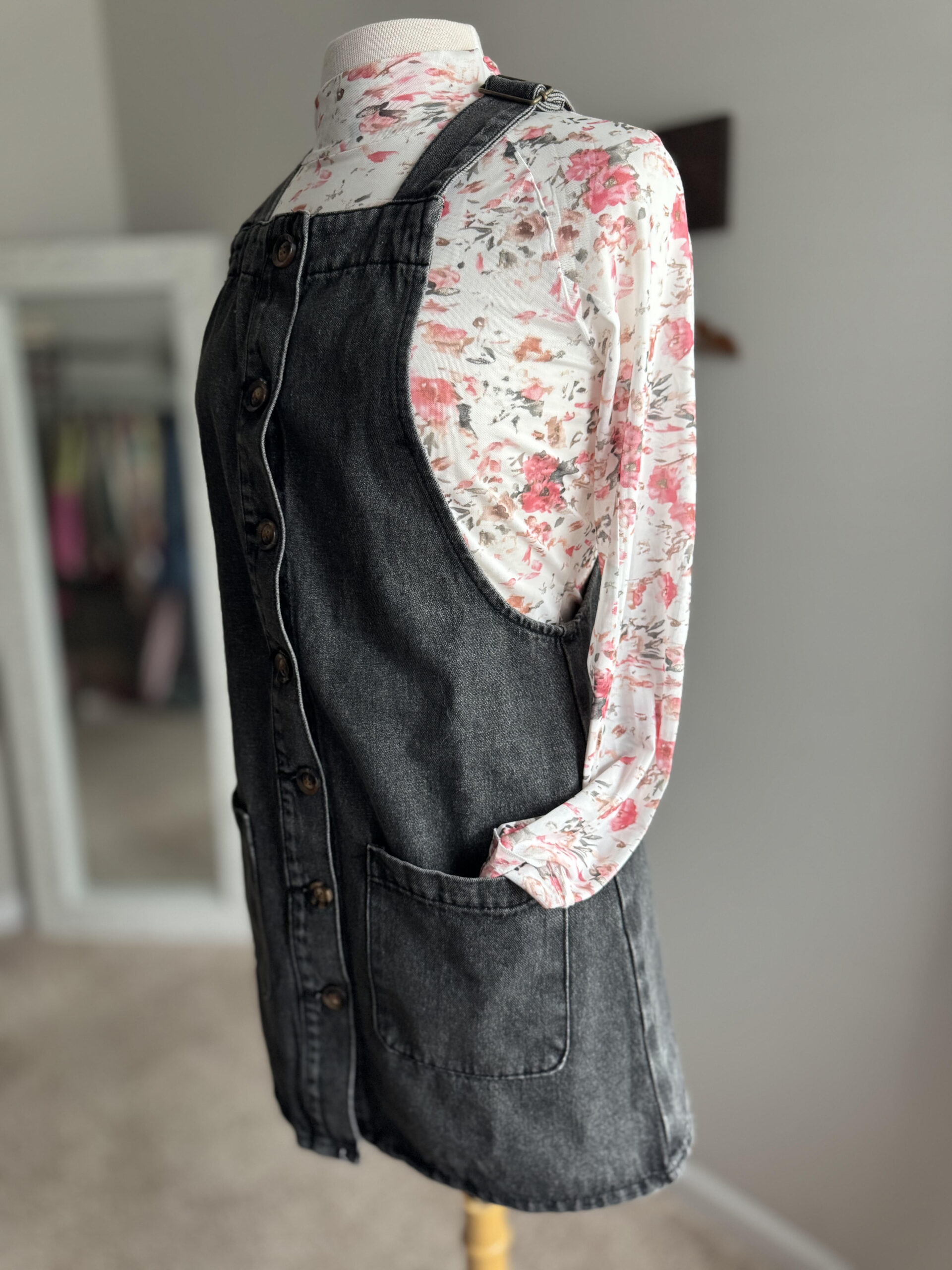 Effortlessly stylish, this Black Denim Jumper Set is a perfect mix of edgy and feminine. The black denim jumper features adjustable straps, functional buttons down the front, and two handy pockets for everyday convenience. Paired with a see-through floral layering top, this set offers a chic, layered look that’s versatile for any occasion.