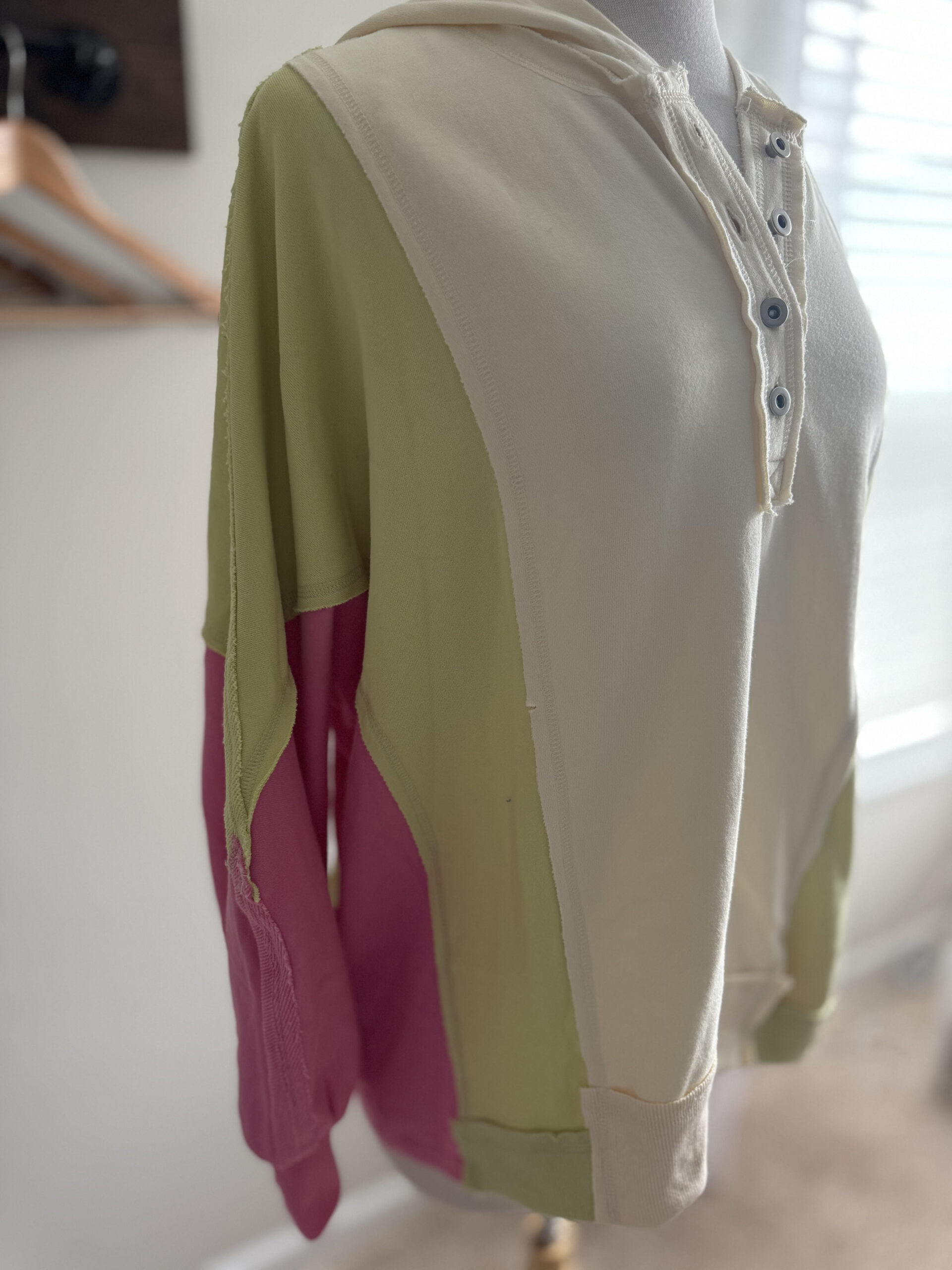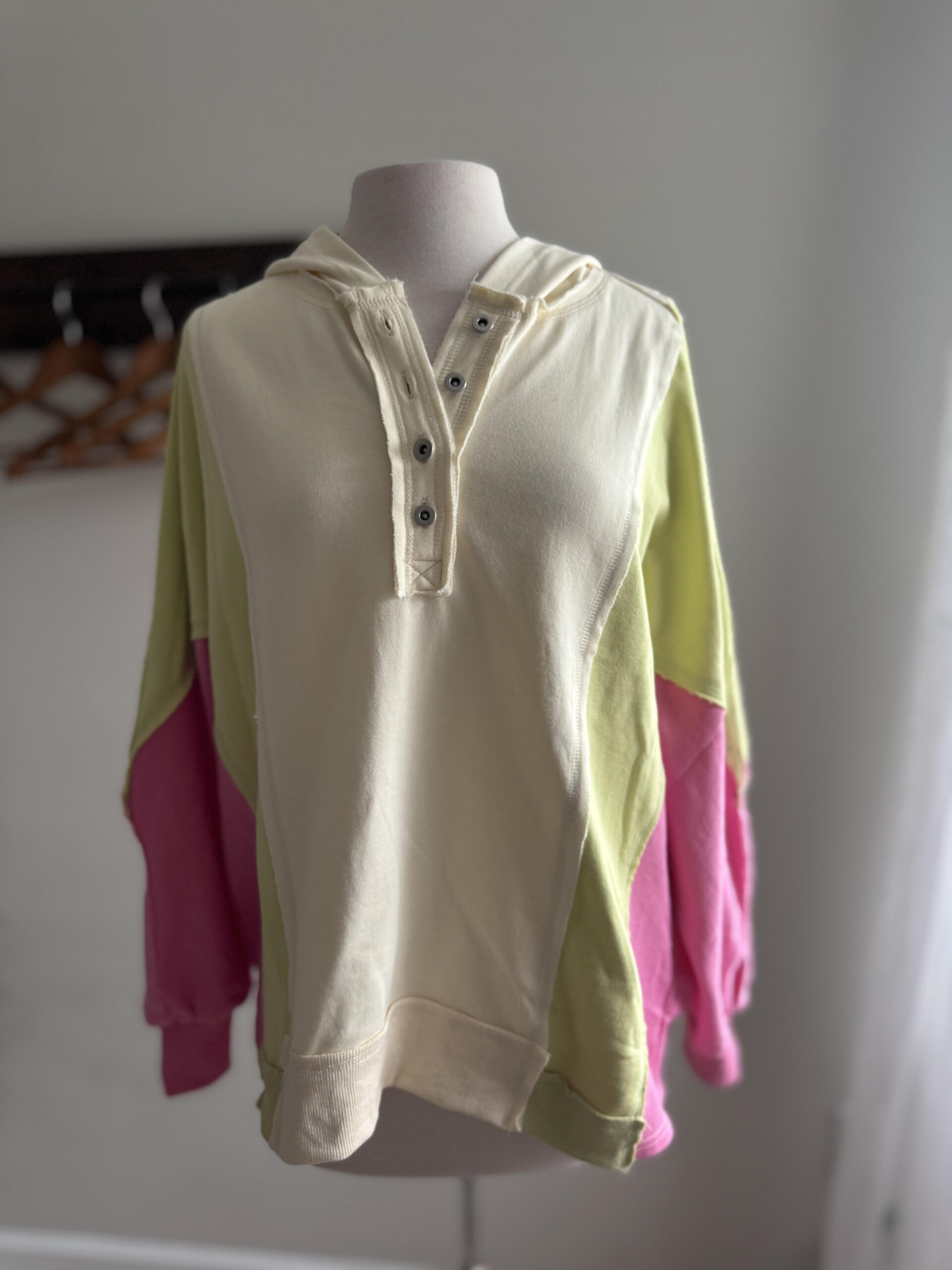 Make a bold statement with this oversized colorblock hoodie featuring a vibrant mix of ivory, bright green, and hot pink. Designed with a laid-back fit, it’s perfect for cozy days or casual outings. The added detail of metal buttons brings a stylish edge, while the soft fabric ensures ultimate comfort. This hoodie effortlessly combines playful colors with a relaxed, chic vibe.