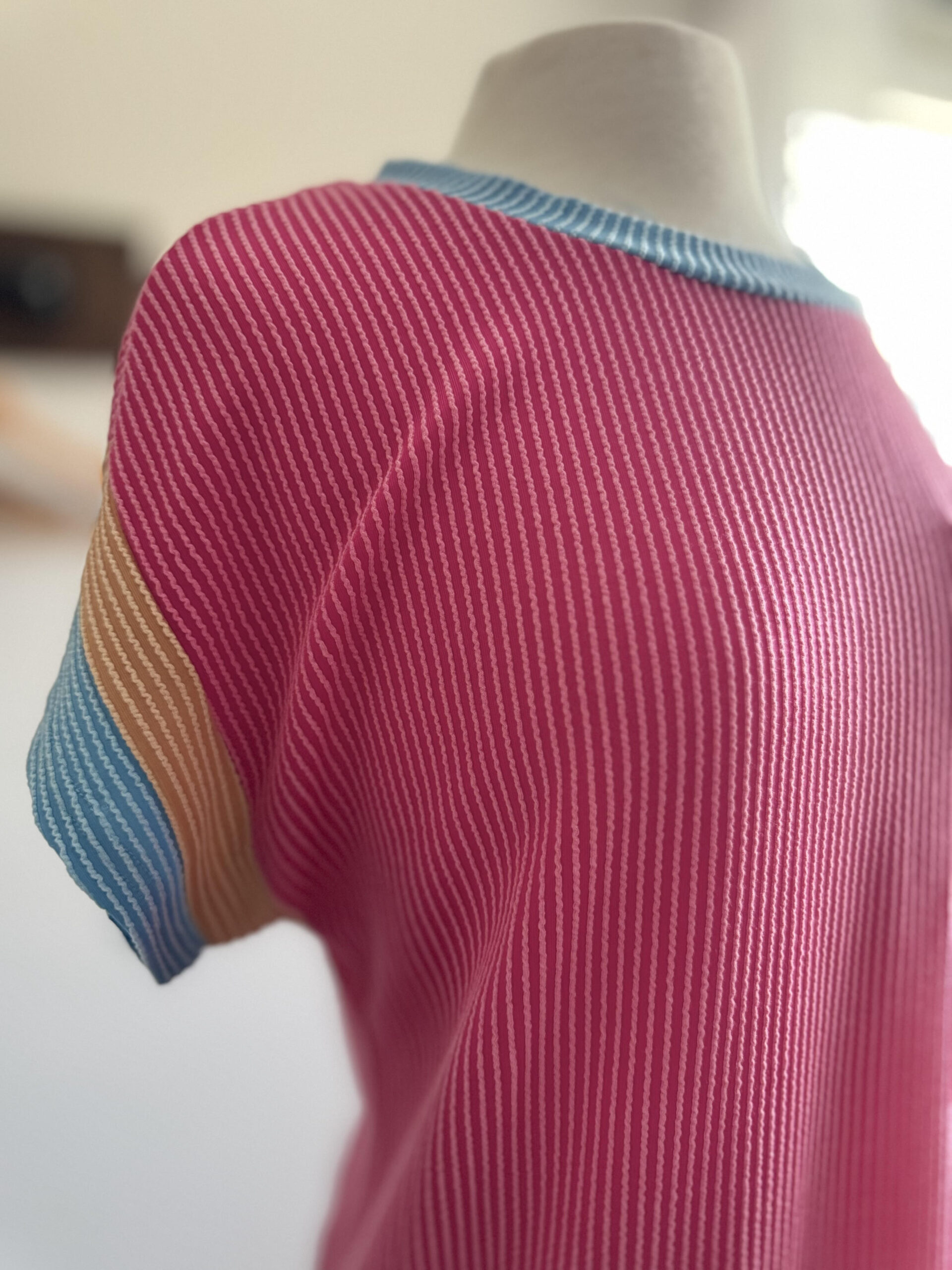 Add a pop of color to your wardrobe with the Colorblock Ribbed T-Shirt Dress. This hot pink dress features bold blue and orange colorblock details for a playful, modern touch. Crafted from ribbed fabric, it offers texture and style, while the above-the-knee length keeps it casual and versatile. A functional front pocket adds a laid-back vibe to this basic T-shirt dress, perfect for any casual outing.