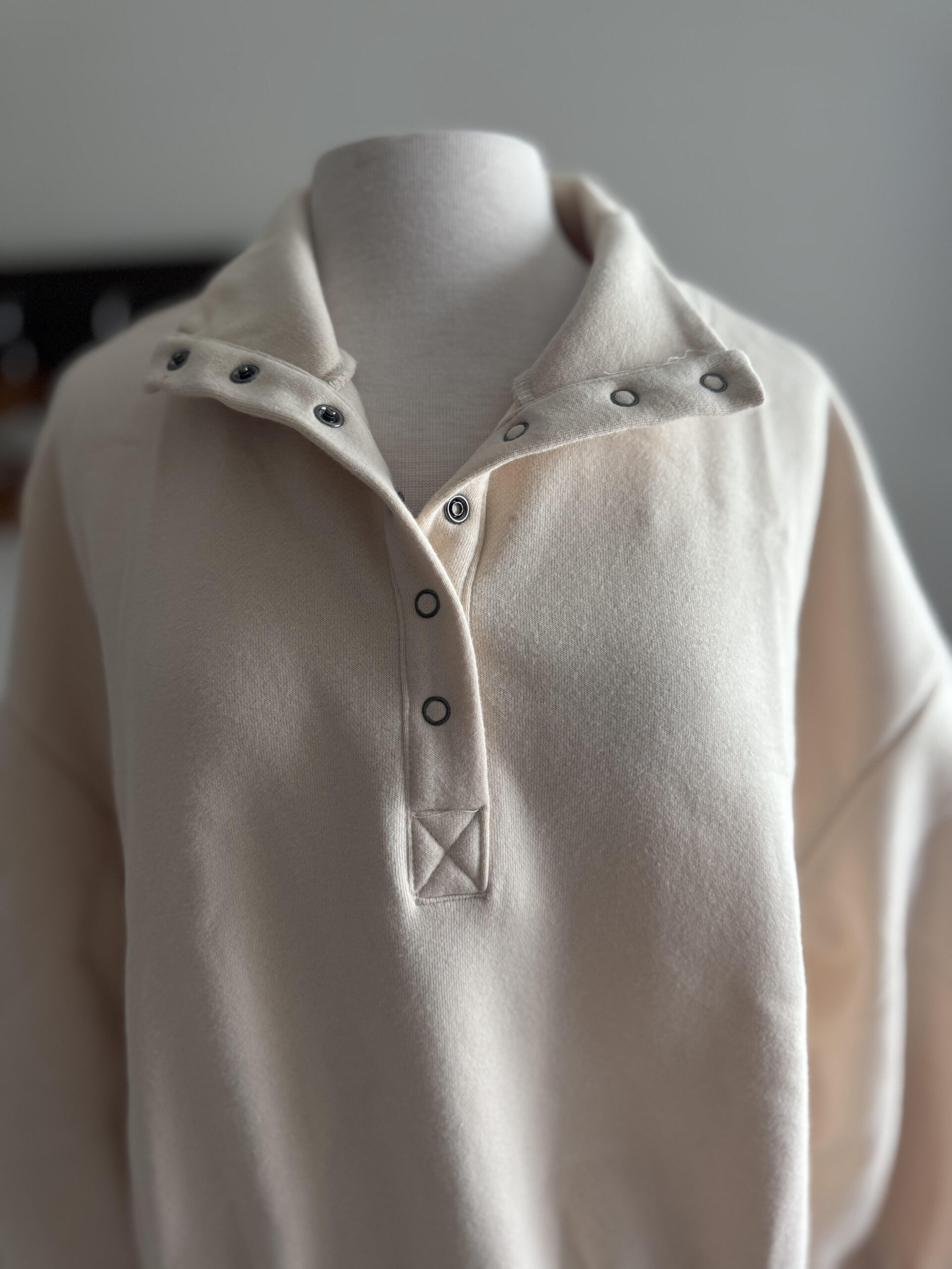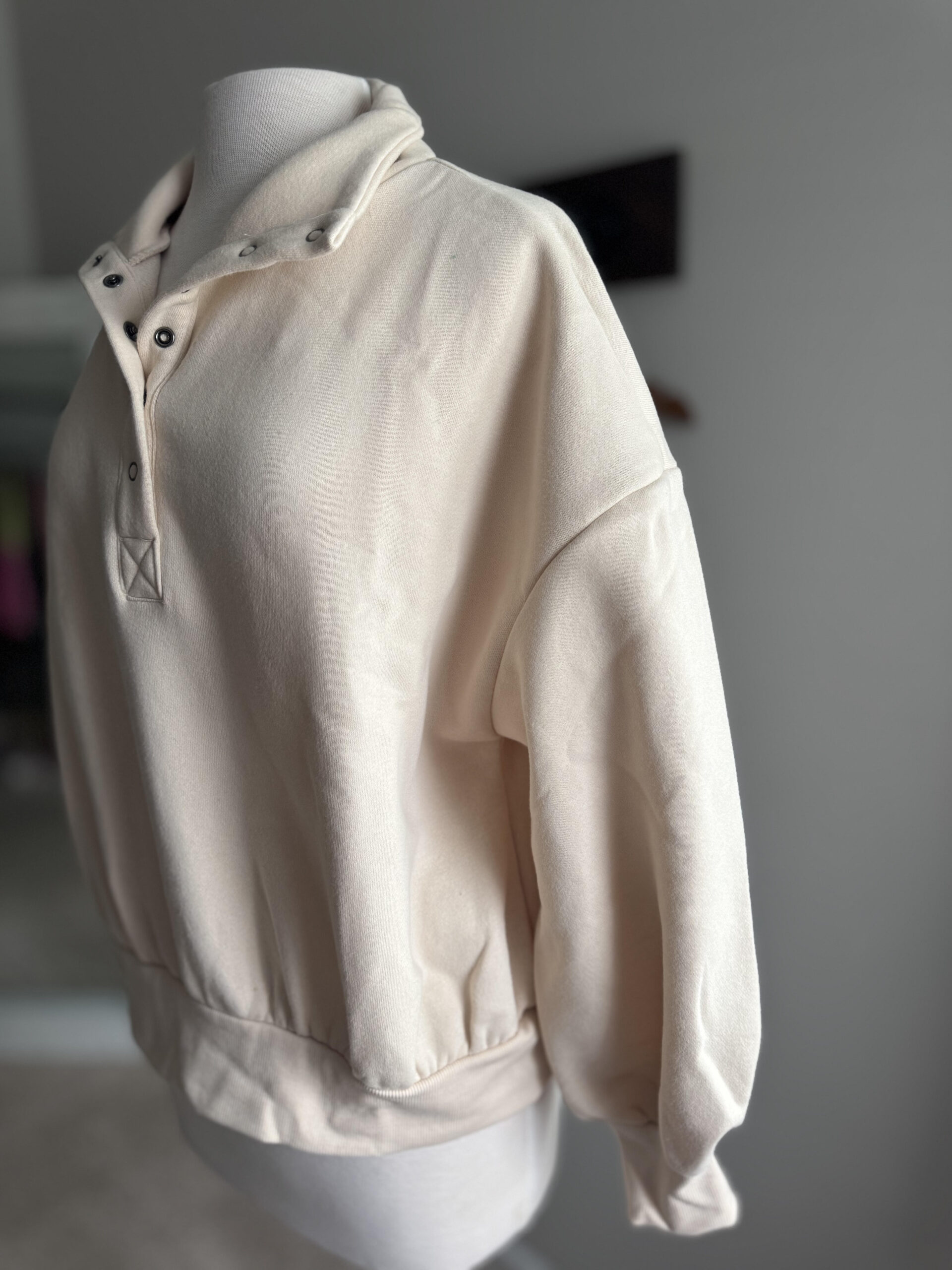 Cozy meets chic with the Cream Balloon Sleeve Henley Pullover. This sweatshirt features a half-button-down design and elegant balloon sleeves for a relaxed yet polished look. The soft cream color makes it easy to style with your favorite jeans or leggings, while the lightweight knit ensures all-day comfort.