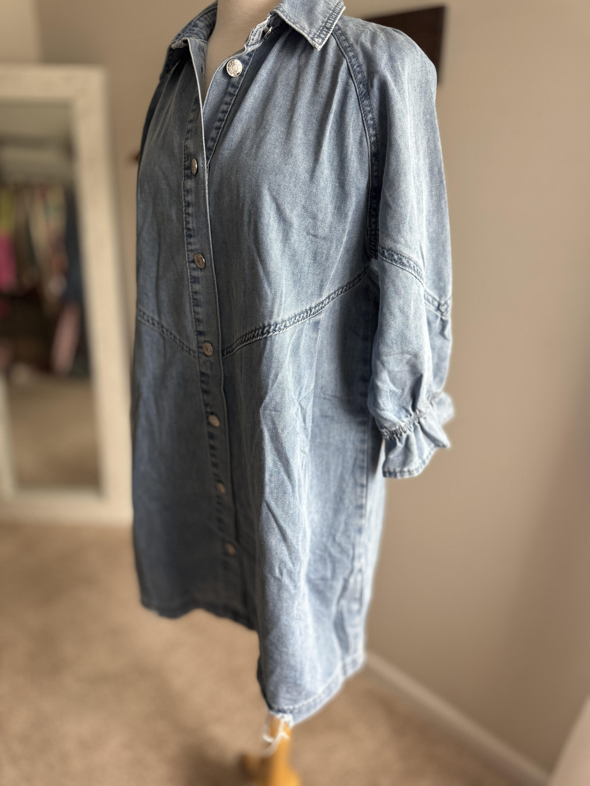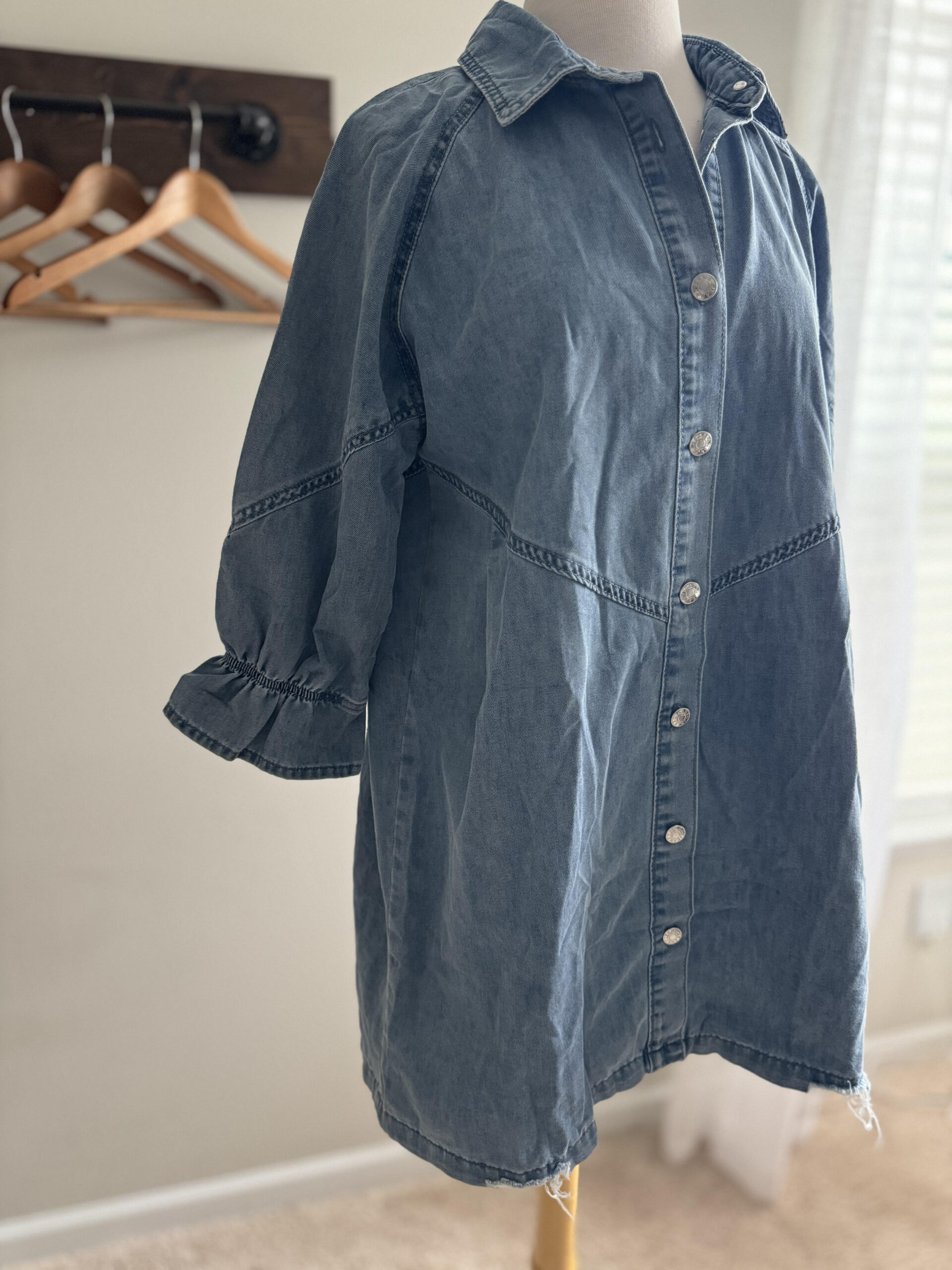 Effortlessly stylish and versatile, the Distressed Charm Denim Dress is your go-to for casual chic. Featuring a flattering button-down design with durable metal buttons, this dress is true to size and perfect for all-day wear. The distressed bottom hem adds a touch of edgy flair to a timeless classic. Pair it with boots or sneakers for a look that’s uniquely you!