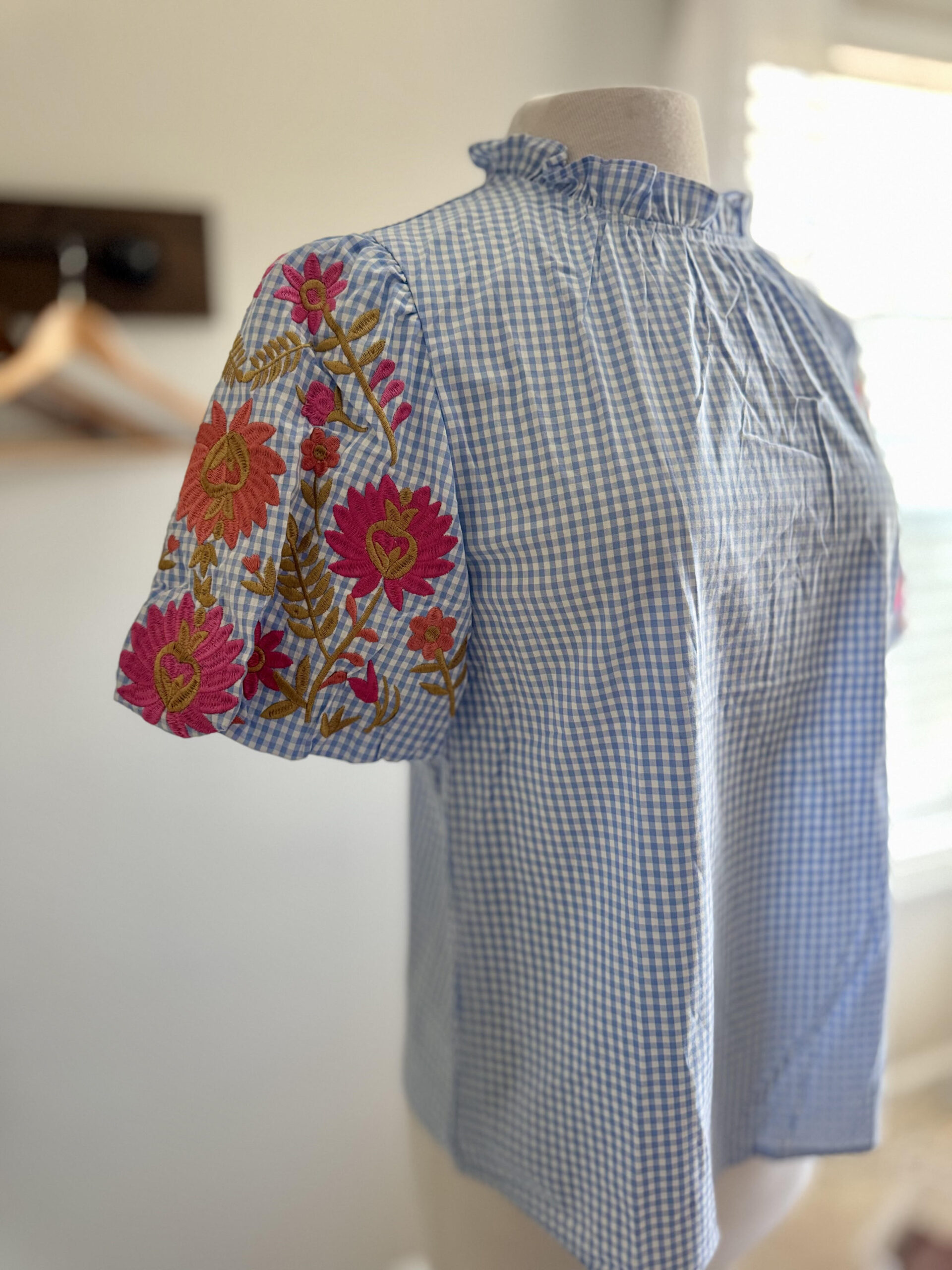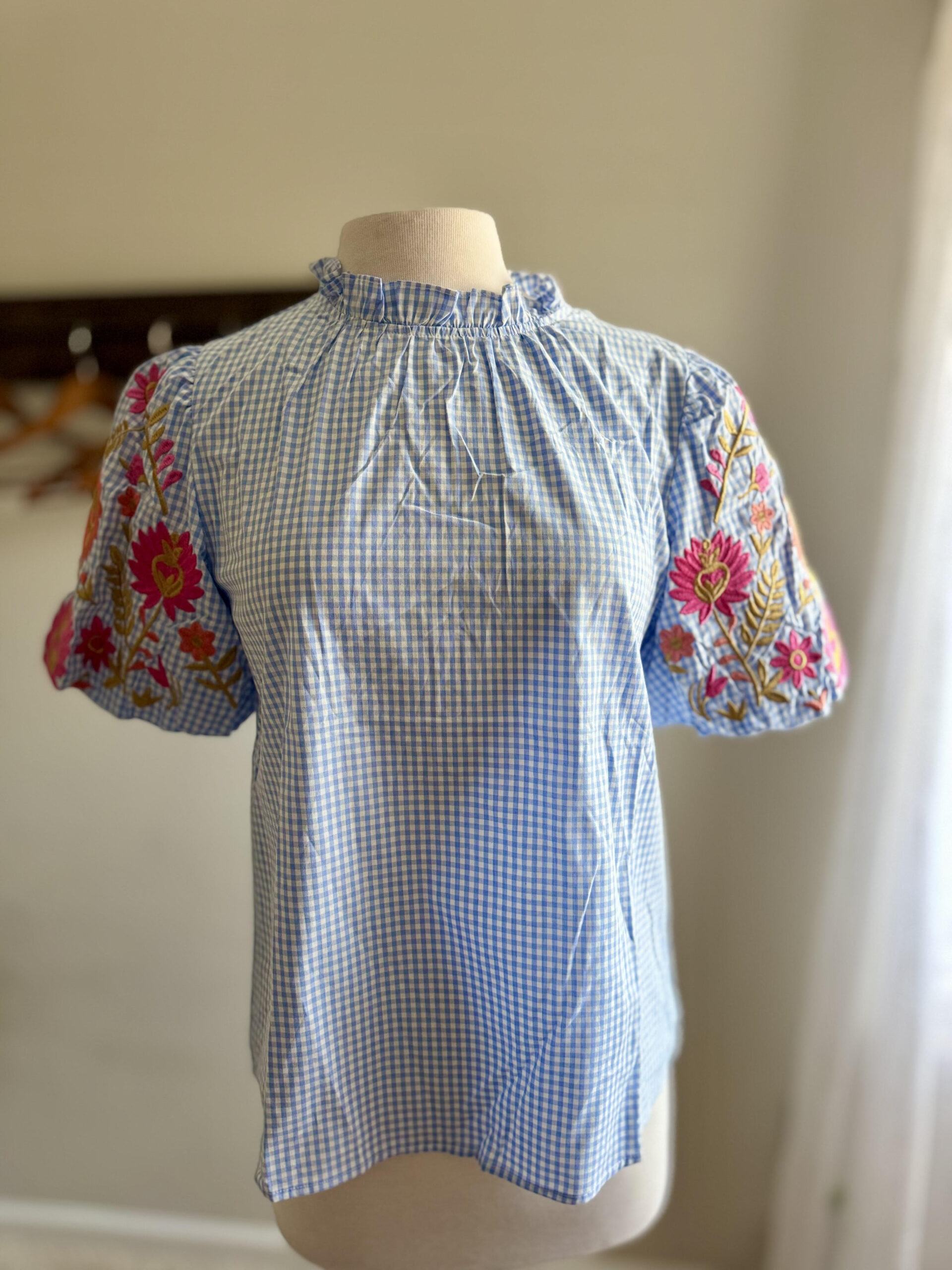 Embroidered Gingham Puff Sleeve Top