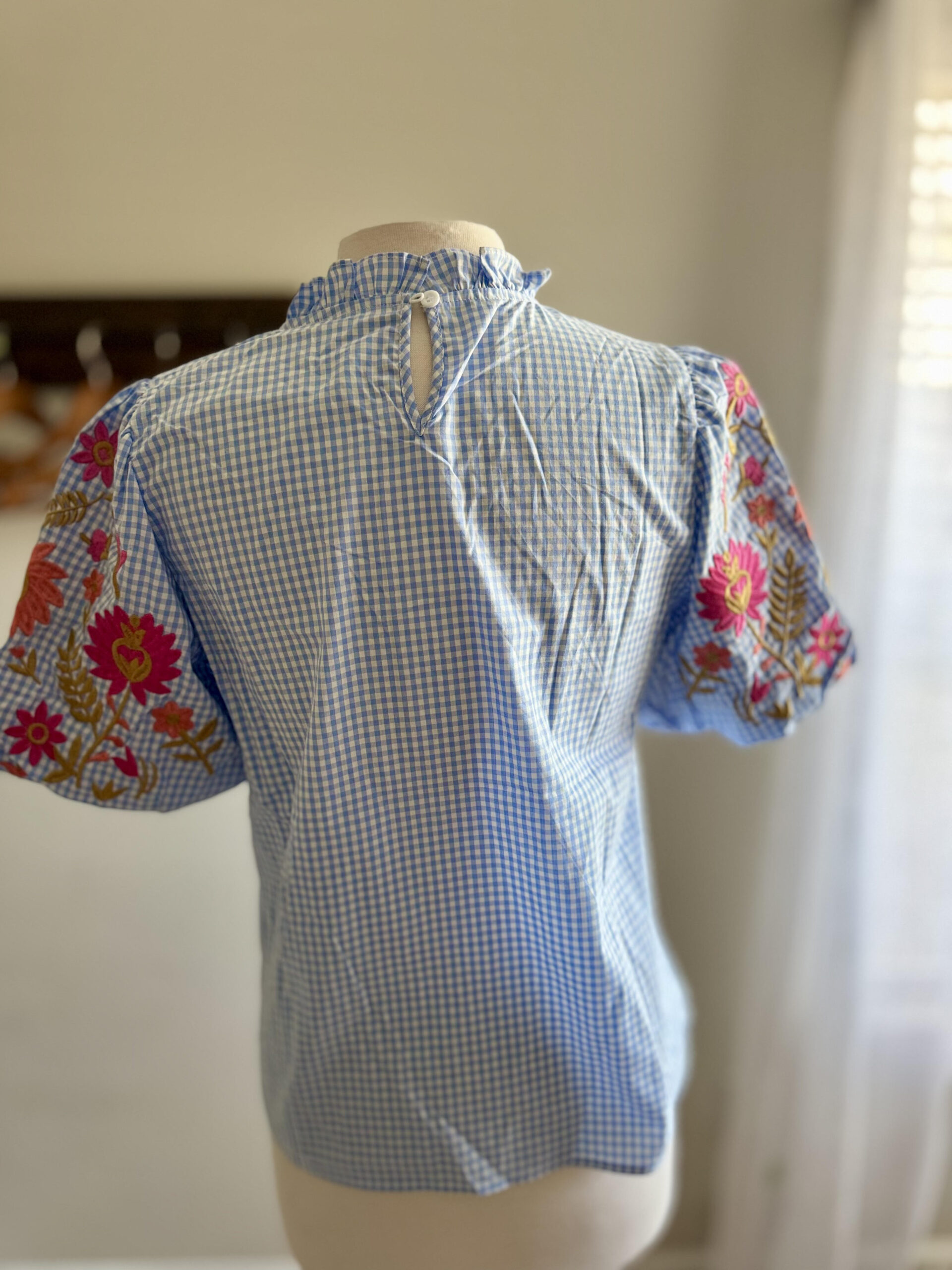 Charming and elegant, the Embroidered Gingham Puff Sleeve Top is a standout piece for any wardrobe. Featuring a classic blue gingham pattern, this fitted top is adorned with delicate embroidered flower designs for a touch of femininity. The puff sleeves and ruffle neck add romantic details, while the button closure at the back of the neck ensures a polished finish. With no stretch, this top offers a structured, tailored look perfect for dressing up or down.