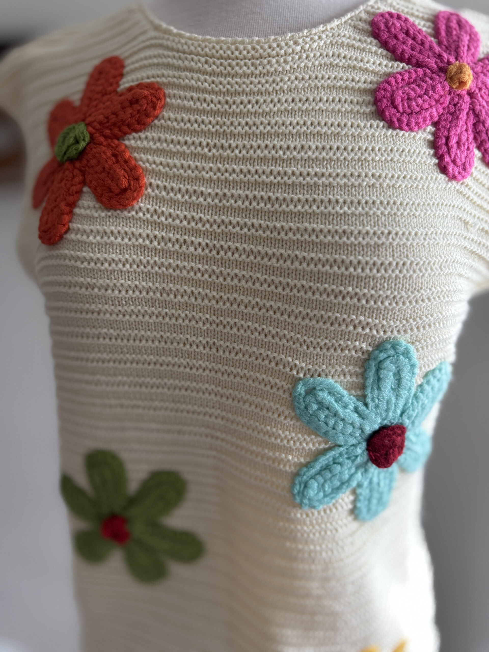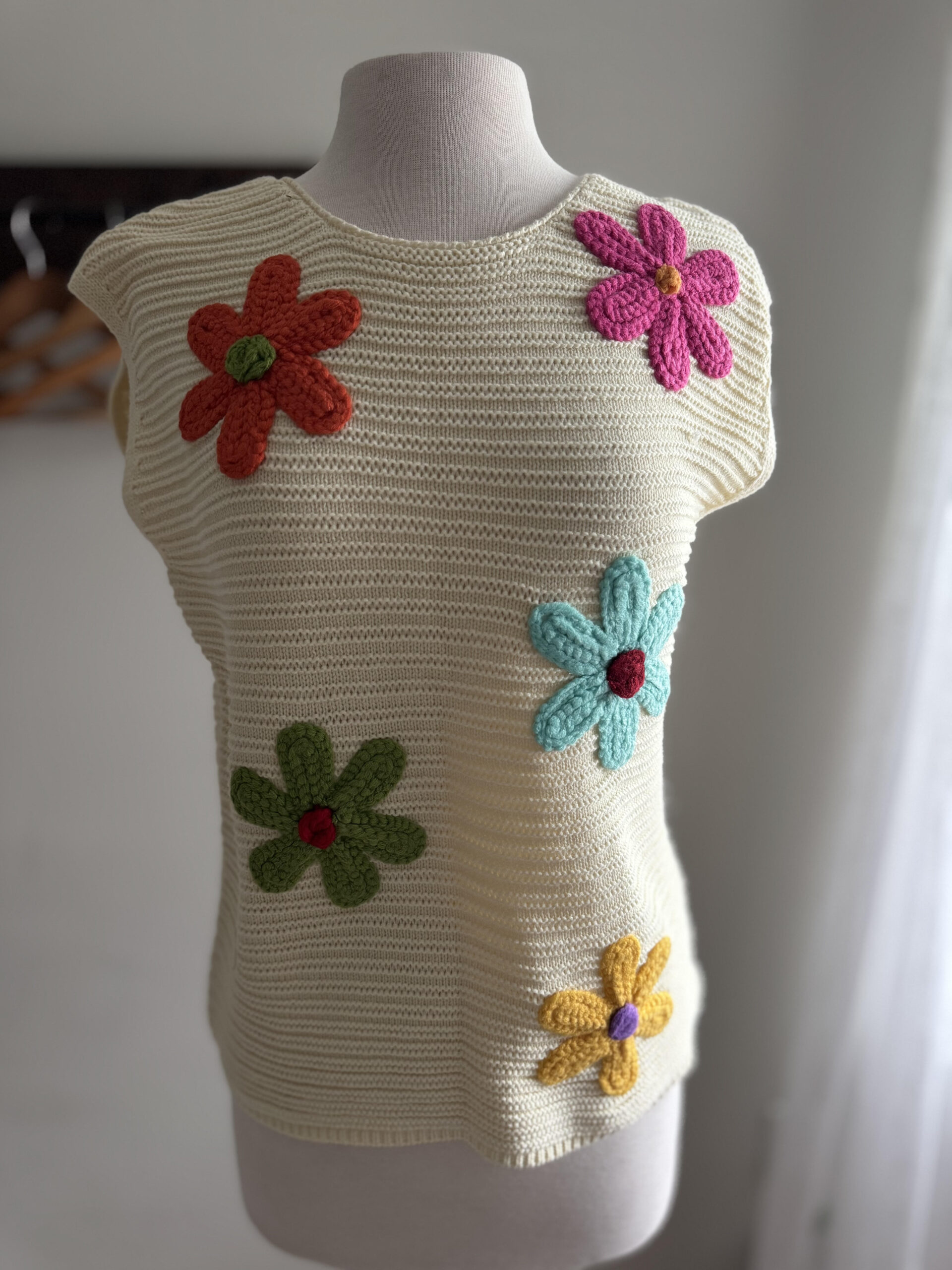 Add a touch of whimsy to your wardrobe with the Floral Crochet Sleeveless Sweater. This cream sweater features a sleeveless design, perfect for layering or wearing on its own, and is adorned with vibrant crochet flowers for a playful, handcrafted look. Its soft knit fabric makes it both stylish and comfortable, ideal for any season.