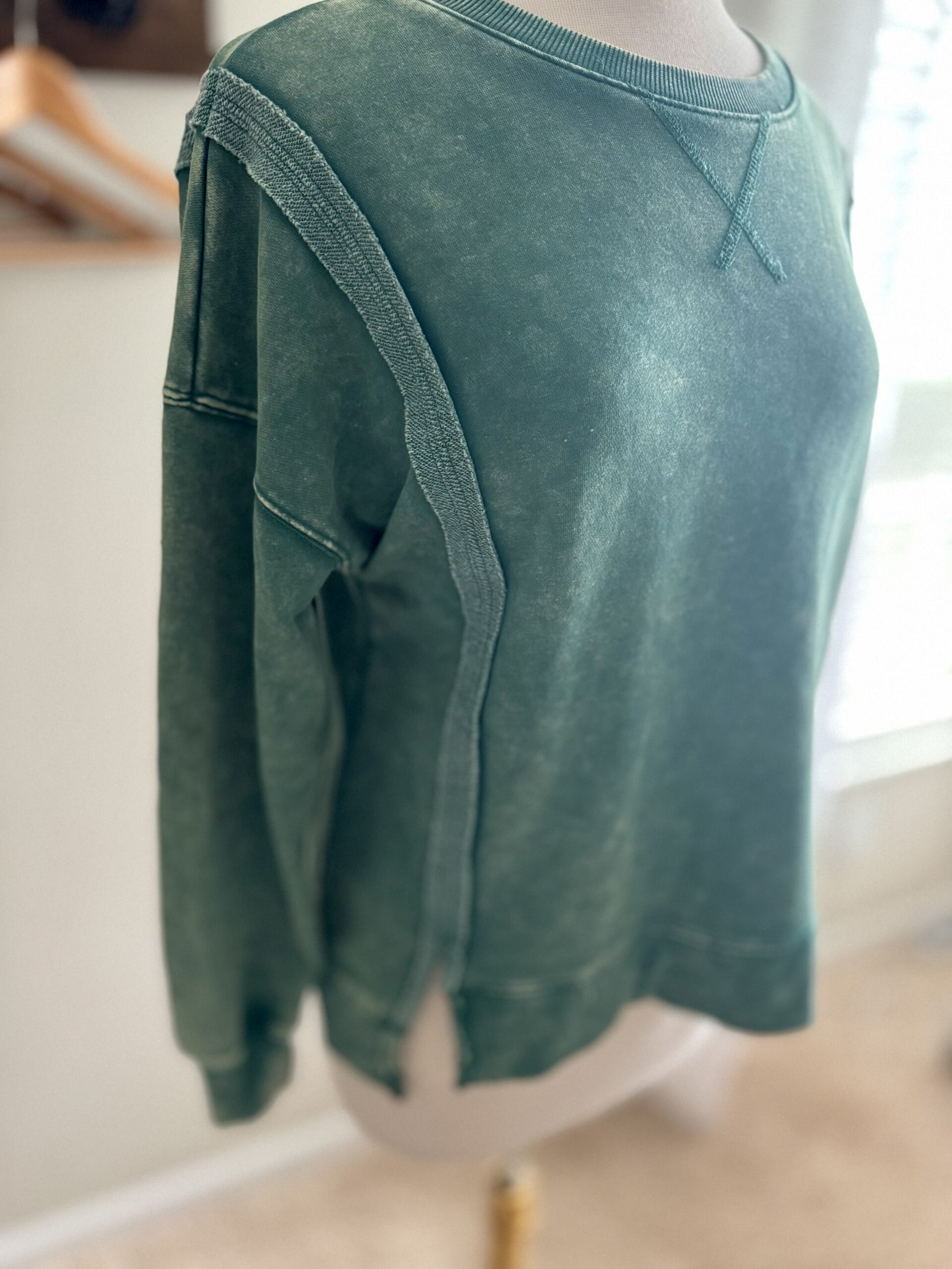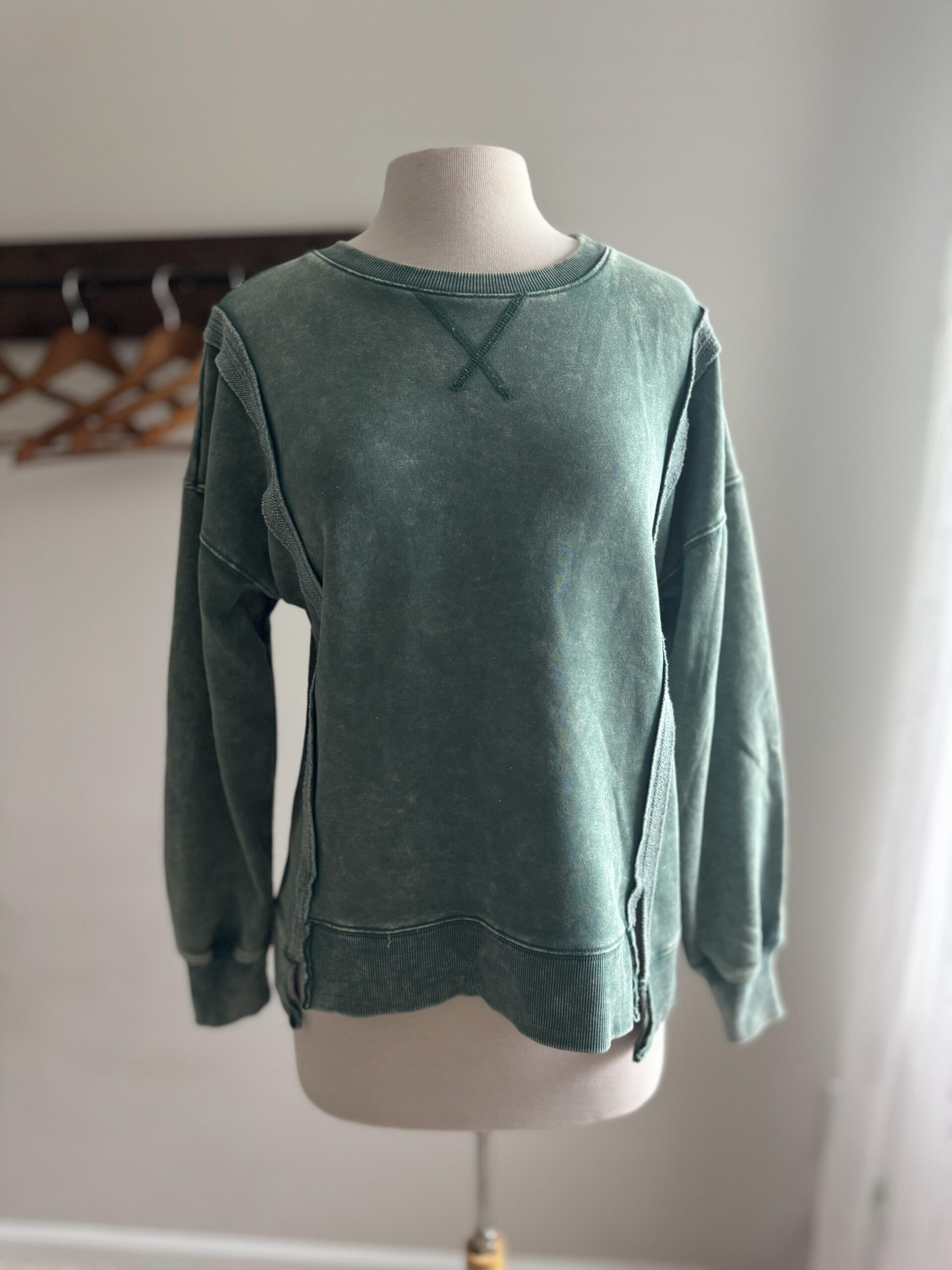 A relaxed and stylish take on a classic, this mineral-washed green sweatshirt features a vintage-inspired finish that gives it a unique, worn-in look. The exposed seams add an edgy, deconstructed vibe, while the soft fabric ensures all-day comfort. Perfect for layering or wearing on its own, this sweatshirt pairs effortlessly with jeans, leggings, or joggers for a casual yet on-trend outfit.