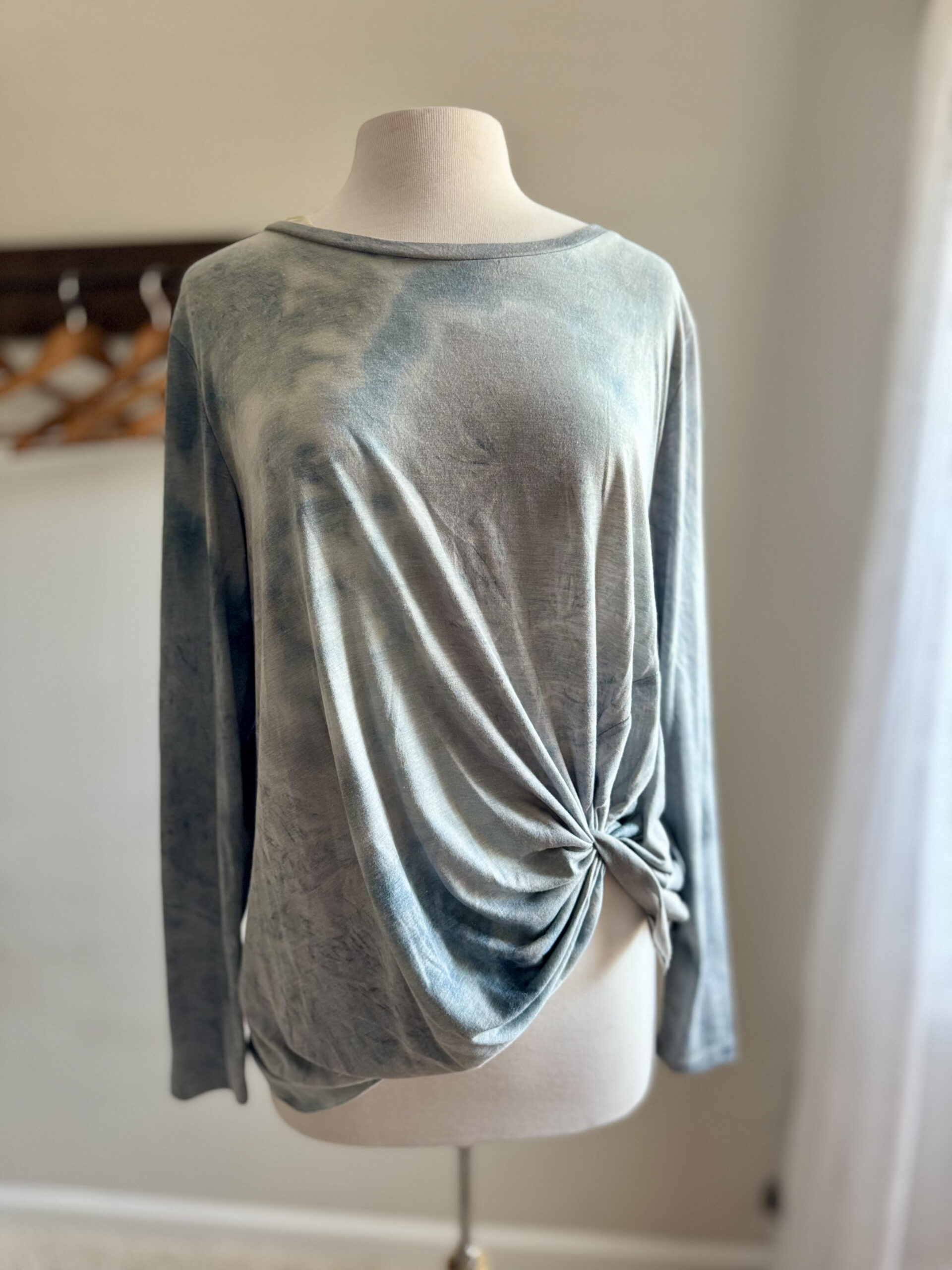 Add a touch of flair to your wardrobe with the Navy Tie-Dye Knot Top. This long-sleeve top features a bold navy tie-dye print and a stylish twisted knot detail at the hem for a trendy, flattering look. Perfect for pairing with jeans or leggings, this top combines casual comfort with a modern twist.
