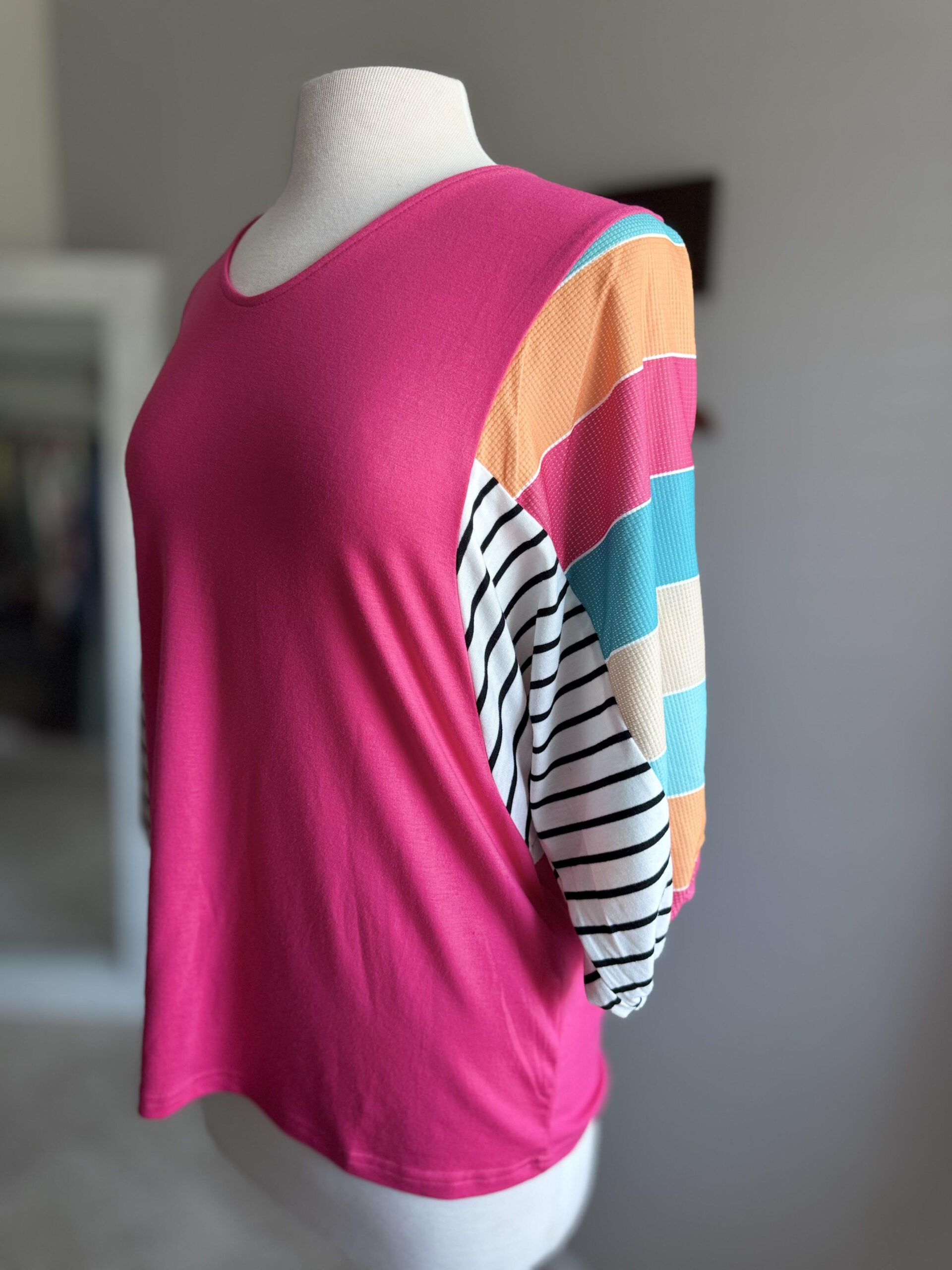 Brighten your day with the Striped Balloon Sleeve V-Neck Top. Featuring a hot pink body and eye-catching balloon sleeves with colorful stripes alongside classic black and white stripes, this top blends bold and playful style effortlessly. The V-neckline adds a flattering touch, making it easy to pair with your favorite bottoms for a standout casual look.