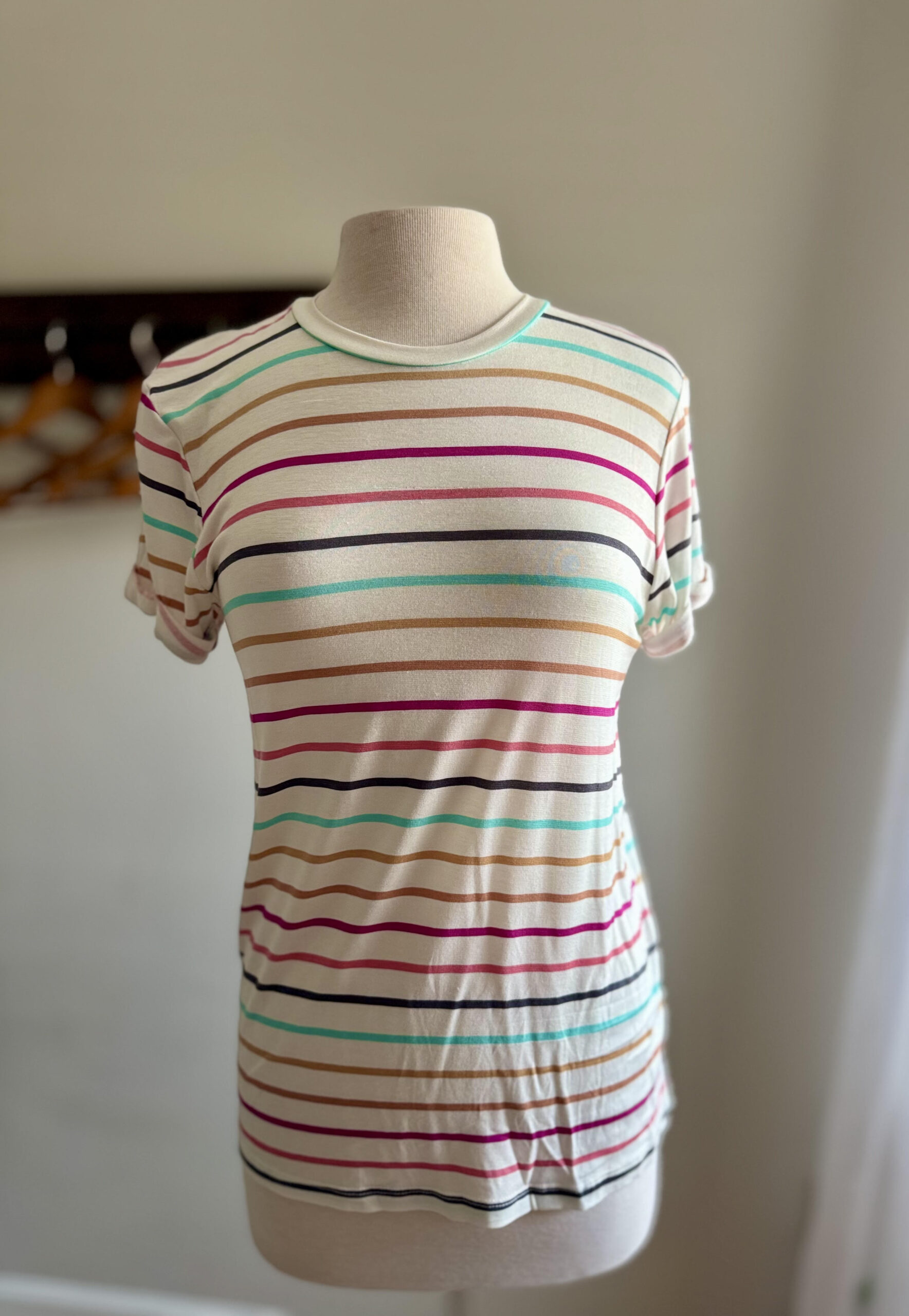 Keep it simple yet stylish with the Striped Soft Cuffed Tee. This basic T-shirt features a blend of bright and neutral stripes, making it a versatile piece for any wardrobe. Crafted from an ultra-soft fabric, it’s perfect for all-day comfort. The cuffed short sleeves add a subtle touch of detail to this timeless favorite.